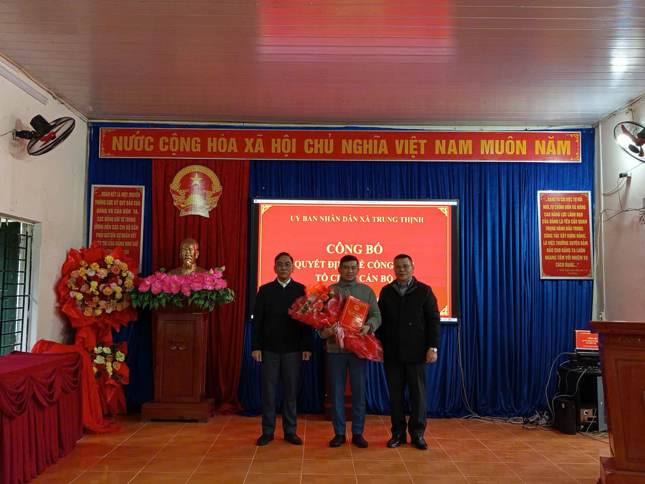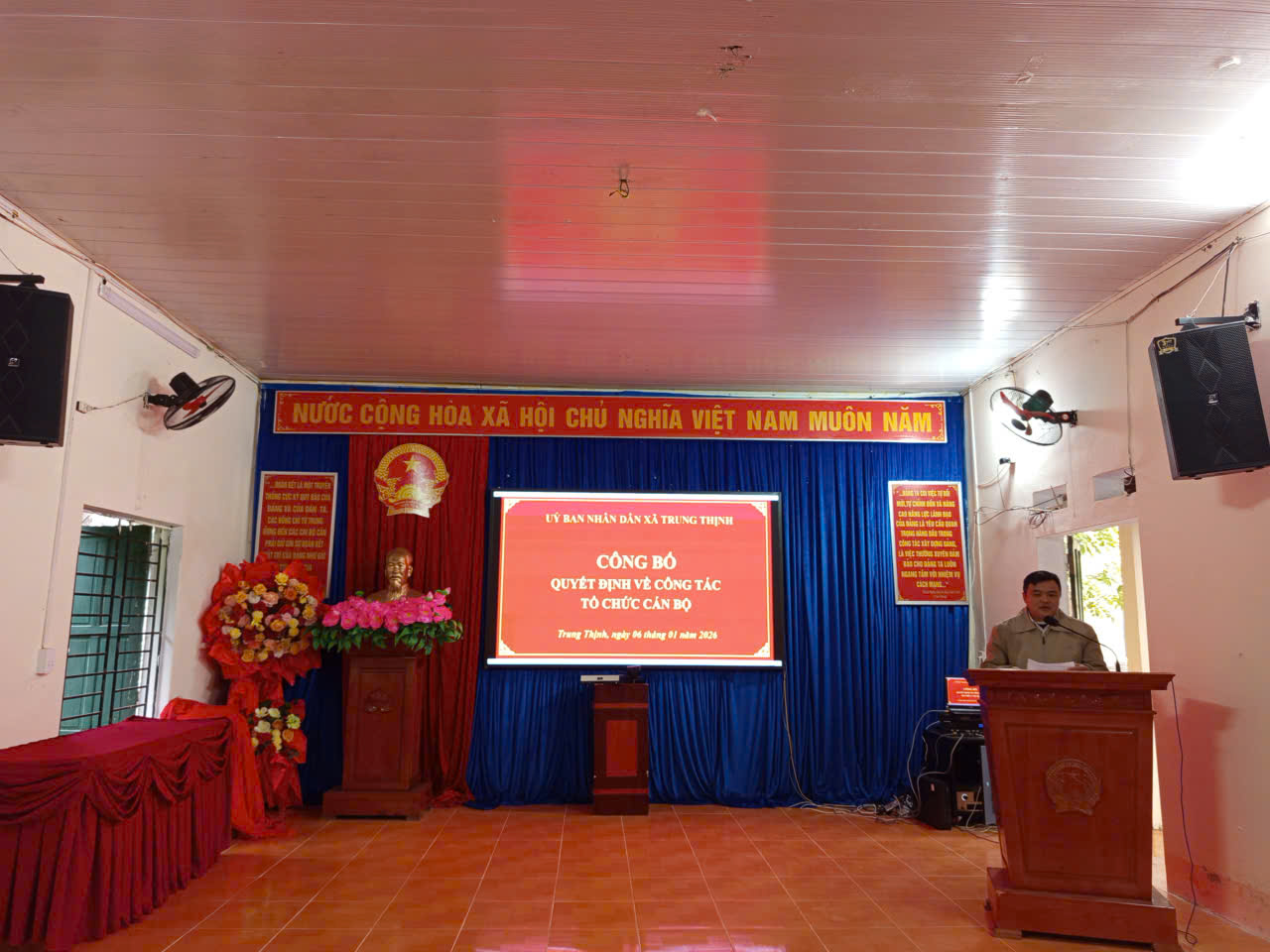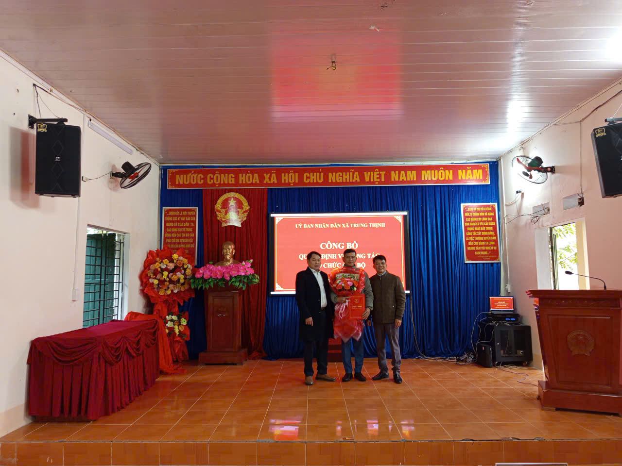 Tại hội nghị đồng chí: Thèn Văn Nghiêm – Trưởng phòng Văn hóa - Xã hội đã công bố Quyết định về việc điều động viên chức quản lý trường học đối với ông Hoàng Văn Mạo, Phó hiệu trưởng Trường Phổ thông Dân tộc Bán trú Trung học cơ sở Trung Thịnh xã Trung Thịnh đến nhận công tác và giữ chức vụ Phó Hiệu trưởng trường Trung học cơ sở Cốc Rế xã Trung Thịnh kể từ ngày 01 tháng 01 năm 2026.